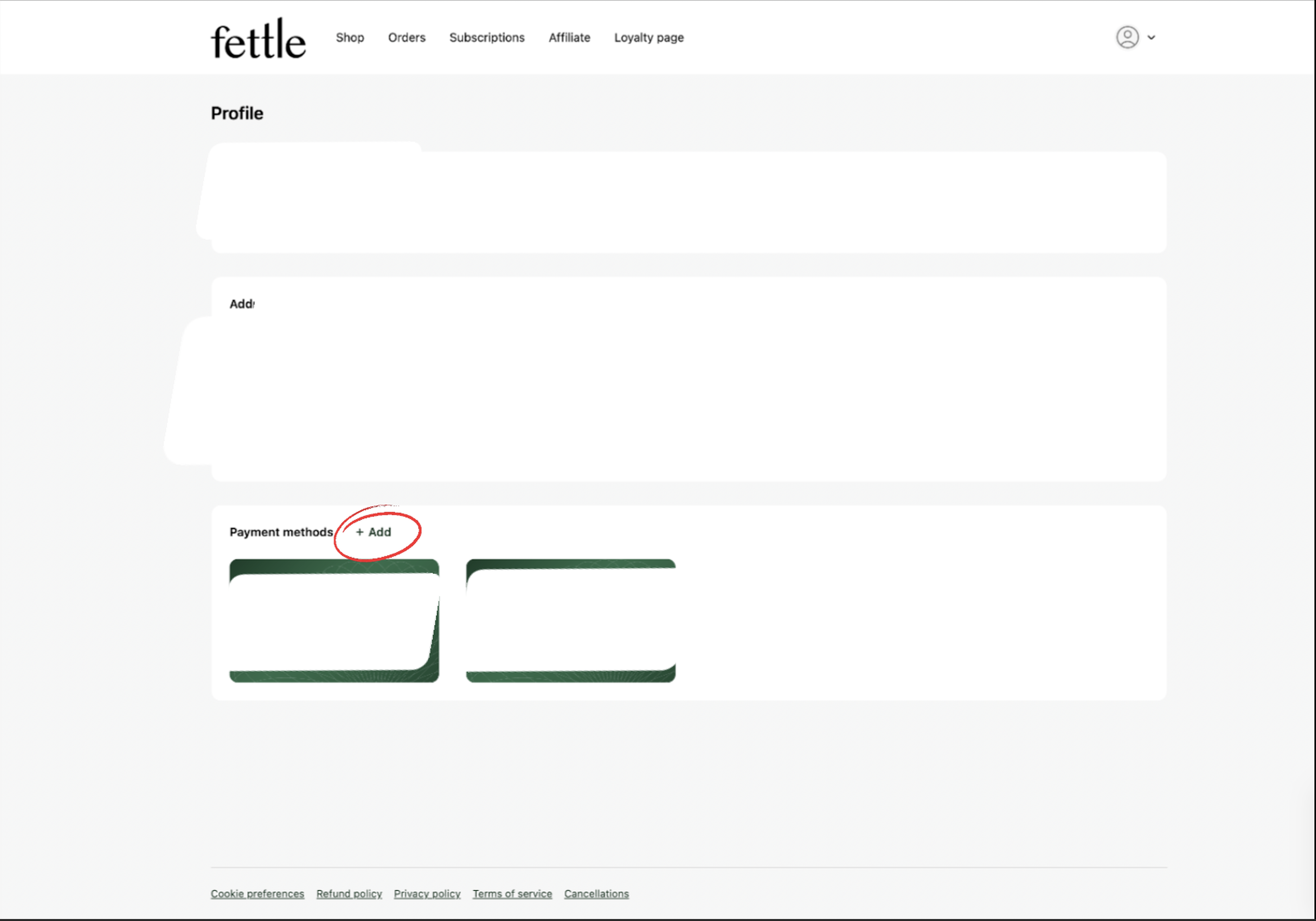 Scroll down to the Payment methods section and click + Add. From here, you can enter your new card details or select an existing card to update.